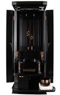 高級家具調仏壇「遥 黒檀」。お仏壇の素材にこだわった逸品で、唐木三大銘木の一つの「 黒檀 」の美しい木目を存分にいかしたお仏壇です。 見た目も美しく、重厚感あふれるデザインに綺麗なクリア塗装を施しています。お厨子扉は珍しいスライド式を採用しており、お厨子上部からの照明が明るく内部を照らします。 電動スライド扉に加え、経机&リン収納型と機能性にあふれ、使いやすさ抜群です。 家具調仏壇の中でも大きさ、材質、機能全てにおいて上質なお品ですので、個人宅の和風・洋風のお部屋だけでなく、会場や拠点にもふさわしい商品となっております。