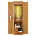 シンプルなデザインながらお仏壇上部にはリーフの彫刻を施し可愛らしいさをアピールしました。また、扉の取っ手部分をクリスタル調か木目調の2種類から選べるのも嬉しい特典となっております。デザインだけではなく機能面も充実しており、仏具設置やリンの収納に便利なスライド式棚や小物の整理に役立つ収納引き出しを完備しました。更にお厨子内部は蛍光灯をつけているため、通常のお厨子よりも、明るさあふれる荘厳な雰囲気を演出。また、お厨子扉はスイッチ式オープン厨子扉を採用しており、お厨子の開閉もスムーズに行えます。