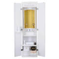 シンプルなデザインながらお仏壇上部にはリーフの彫刻を施し可愛らしいさをアピールしました。また、扉の取っ手部分をクリスタル調かゴールド取っ手の2種類から選べるのも嬉しい特典となっております。デザインだけではなく機能面も充実しており、仏具設置やリンの収納に便利なスライド式棚や小物の整理に役立つ収納引き出しを完備しました。更にお厨子内部は蛍光灯をつけているため、通常のお厨子よりも、明るさあふれる荘厳な雰囲気を演出。また、お厨子扉はスイッチ式オープン厨子扉を採用しており、お厨子の開閉もスムーズに行えます