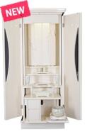 美しいパールホワイト塗装が綺麗な高級家具調仏壇【新世紀】パールホワイトのキラキラした輝きはお部屋に設置して頂くと高級感や重厚感を感じられるデザインです。厨子扉部分は、蒔絵職人が真心を込めて描いた枝垂れ桜蒔絵を施すことで可愛らしさを演出しました。更に、大扉にスモークガラスを採用するなどオシャレなデザインを採用!!お厨子扉は電動式スライドを採用しており、スイッチひとつで自動で開閉できます。 電動スライド扉に加え、とても便利な経机&リン収納型と機能性にあふれ、使いやすさ抜群の高級家具調仏壇です。