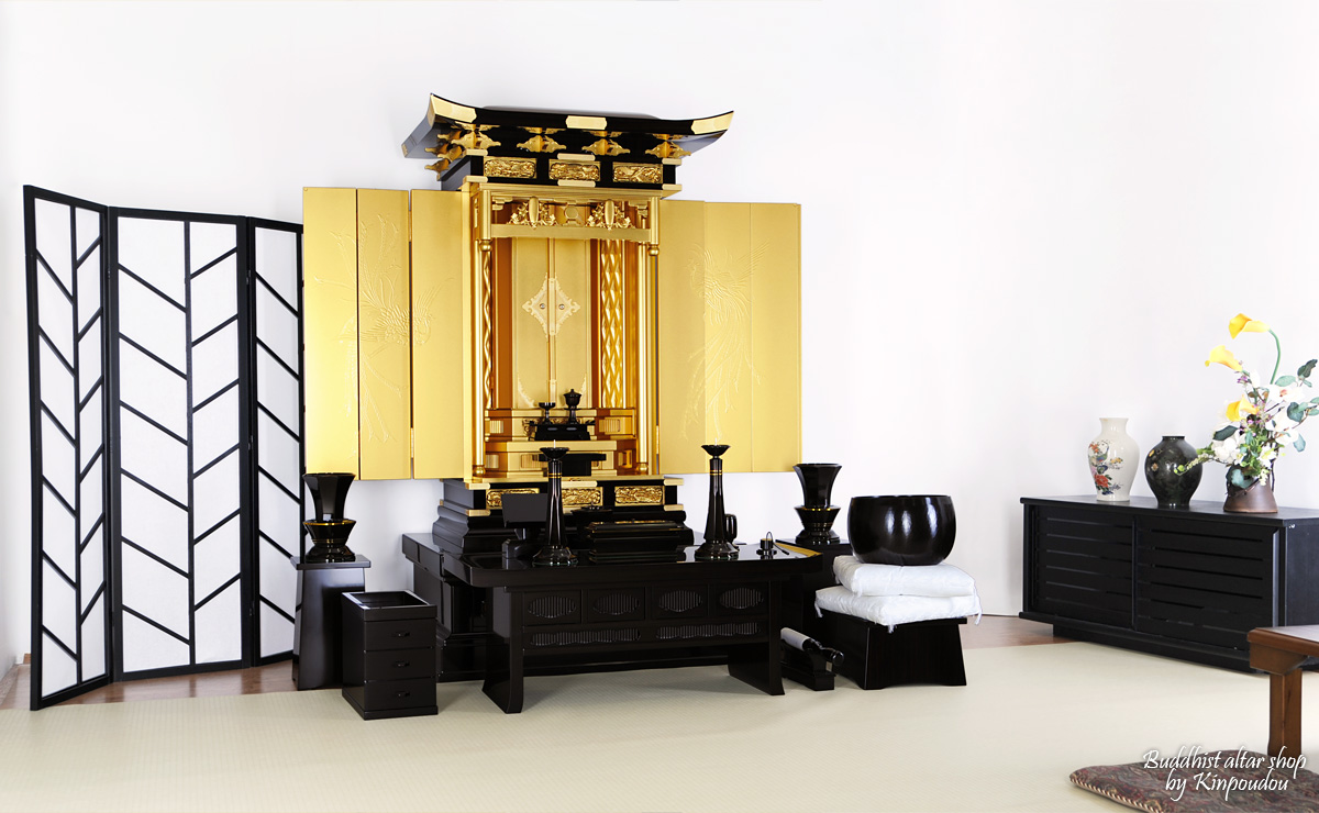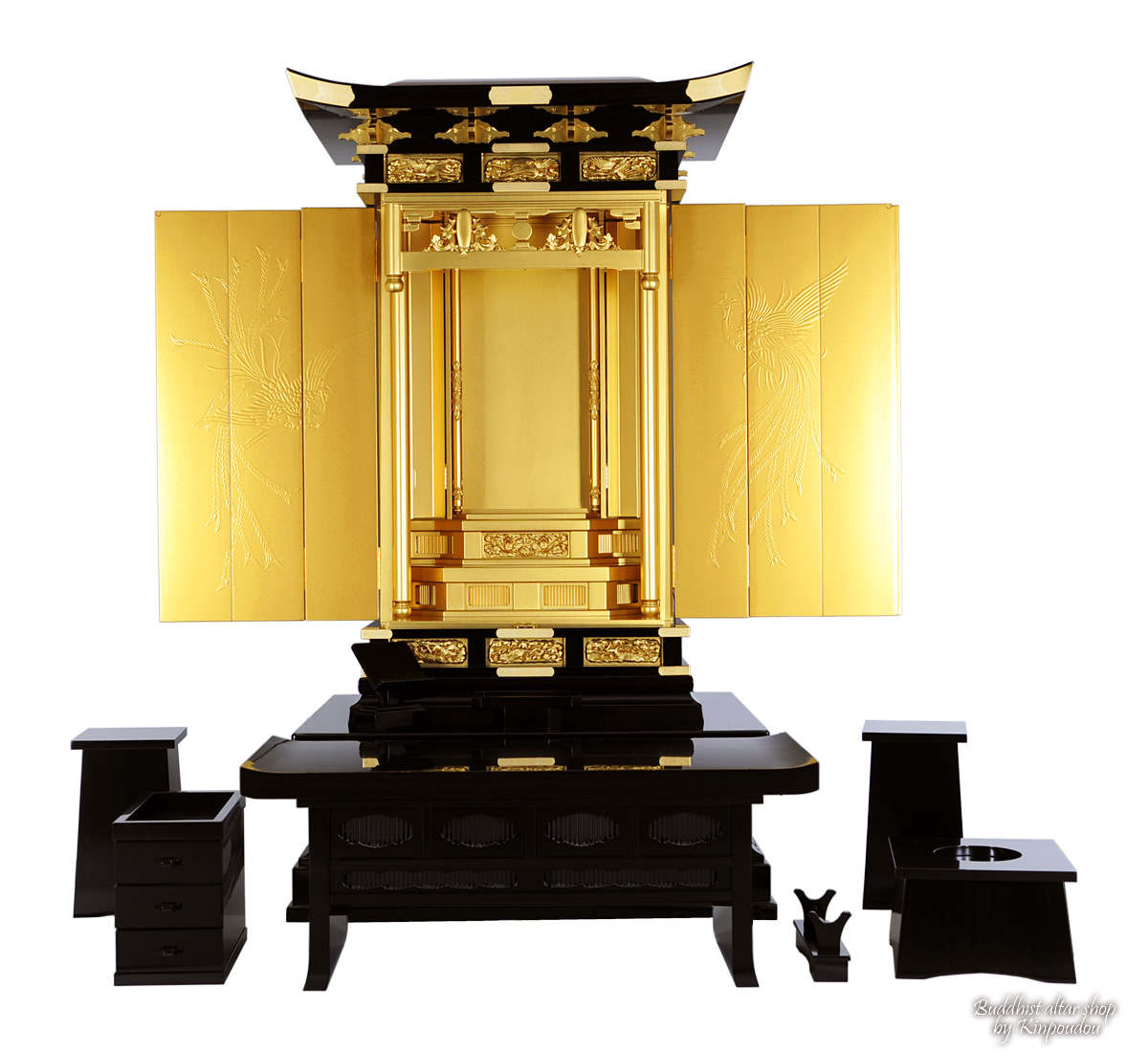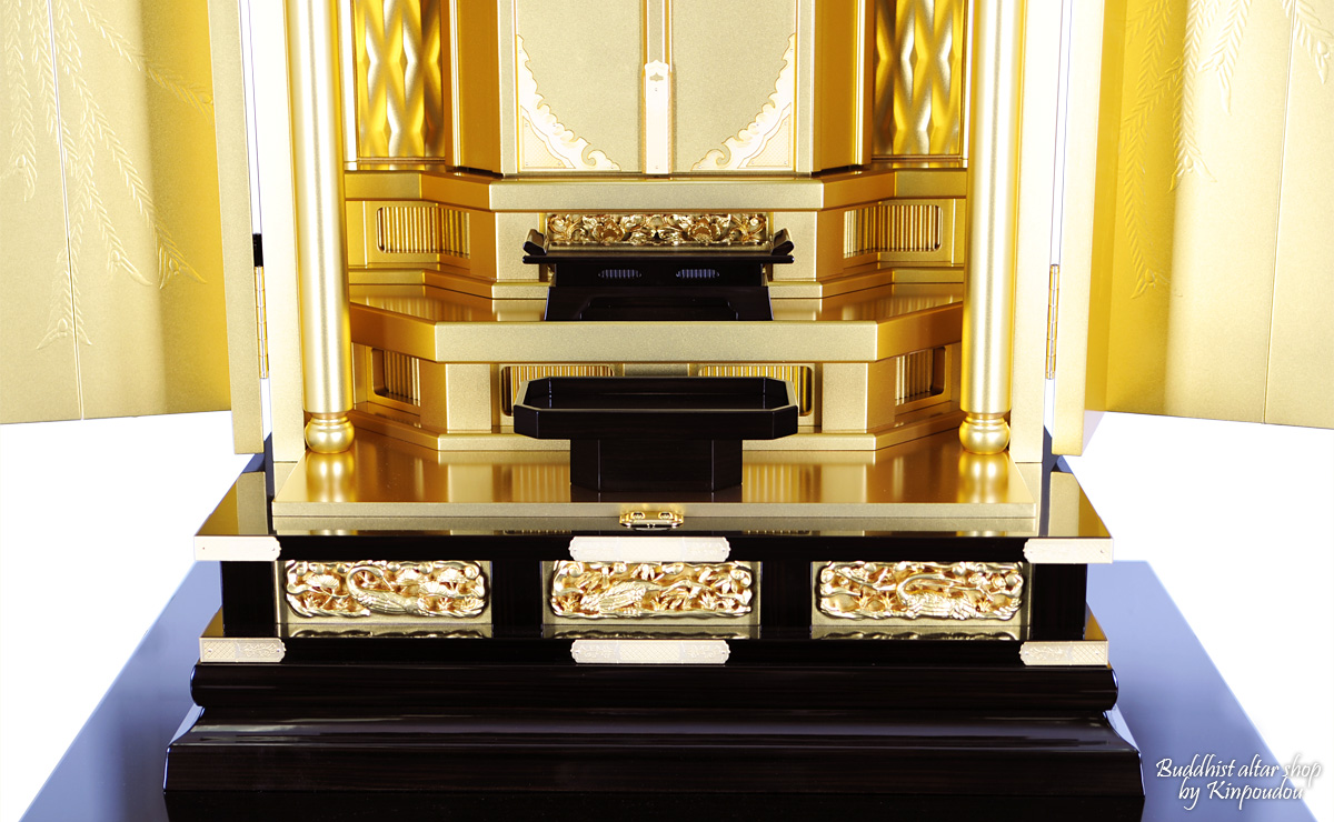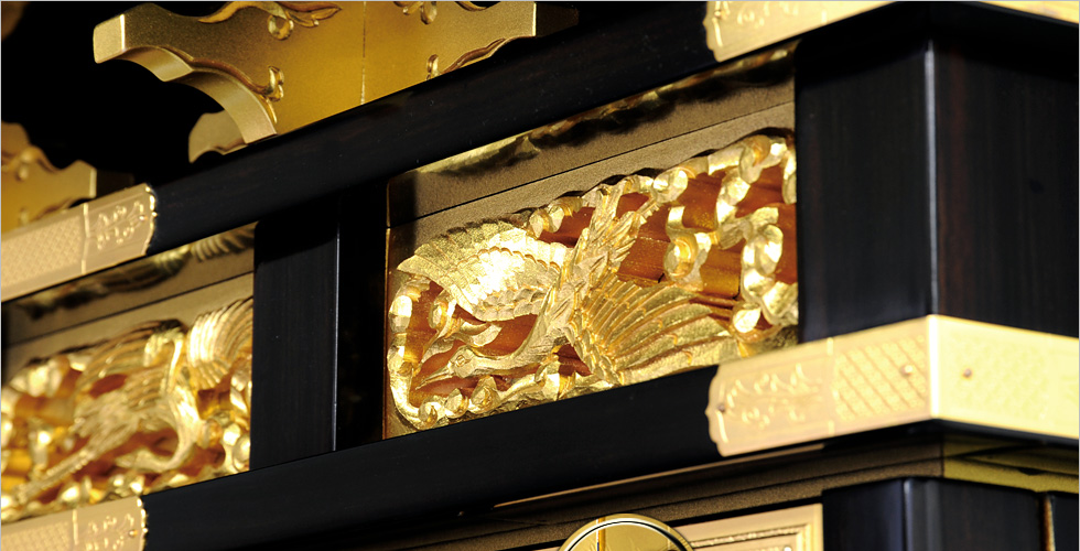 世界三大唐木黒檀と金吹きクリアー塗装の最高峰の高級大型厨子型伝統仏壇『白鳳 黒檀』。全ての作りが匠の逸品と呼ぶにふさわしい文句なしのお仏壇です。二重お厨子扉を採用し奥のお厨子扉には、凛とした白鳳の蒔絵を施しています。さらに大扉にも優雅に旅立つ白鳳を描き、局部の装飾も素晴らしい作りになっています。