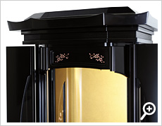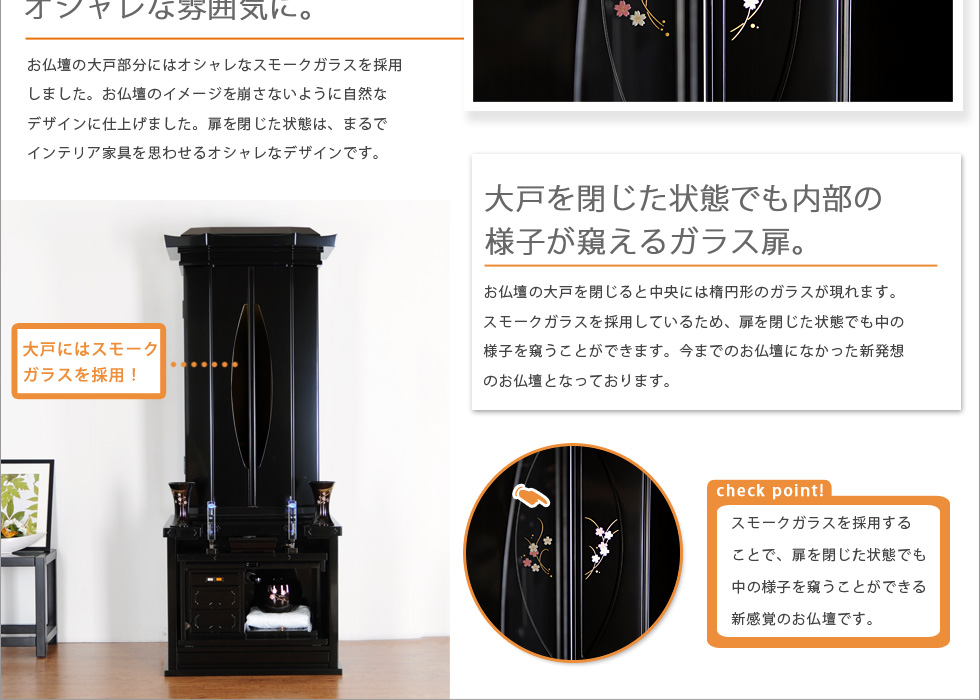 仏壇の産地徳島産の高級厨子型仏壇で、全工程を手作業で丁寧に作られた安心の国産仏壇です。徳島県の伝統特産品として認められた証として徳島県伝統的特産品ロゴマークを取得しました。伝統型仏壇でありながら、スタイリッシュな屋根を採用したり、大戸にはスモークガラスを使用することで欧風家具のようなインテリア性に優れた商品となっております。更に機能面も安心の、電動お厨子扉や経机収納型を採用するなど機能性を追求した使い易さも抜群のお仏壇となっています。