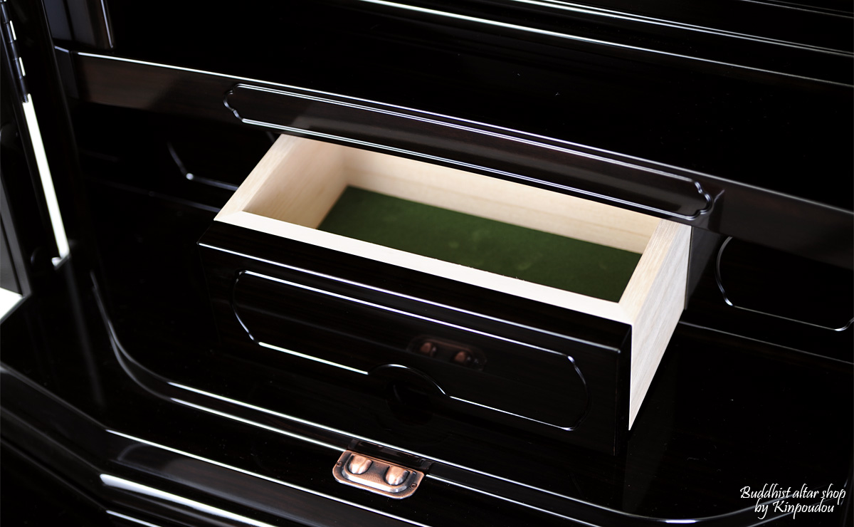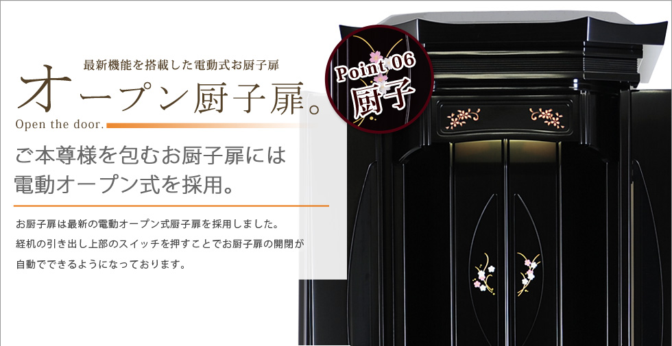 | ■ 機能 | 電動式オープン厨子扉(内折式) / 経机&リン収納型 / 収納引き出し |