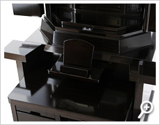 しかしながら黒檀の美しい縞模様を完全に再現することで、重厚感ある力強いデザイン性を実現しました。また、機能面も安心の、電動お厨子扉や経机収納型を採用するなど機能性を追求した使い易さ抜群のお仏壇となっております。