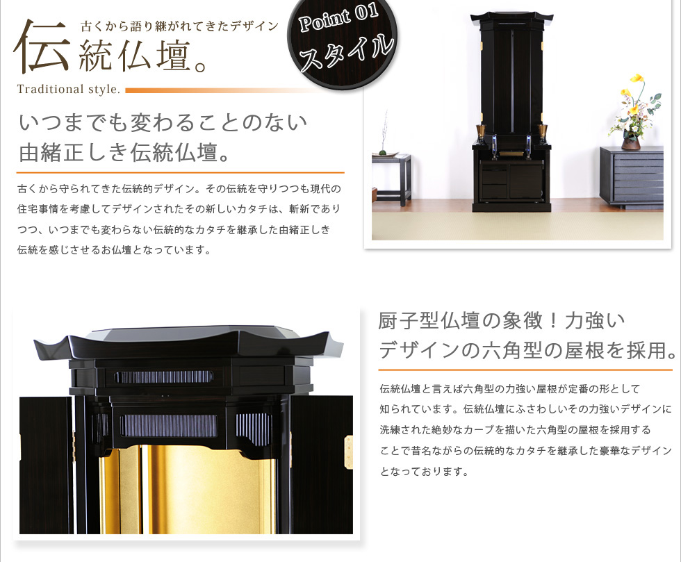 従来から受け継がれて来た伝統的デザインを活かしつつ現代のスタイルに合わせて製作された厨子型仏壇『光明 黒檀 56-22』が登場しました!お仏壇の素材に「 光明 黒檀 56-22 」を採用することで低価格を実現しました。