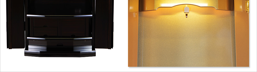 シンプル且つコンパクトなそのフォルムは、まるで高級家具を思わせるデザイン性となっております。また、お厨子部分には天井からだけではなく、下からも明るく照らしてくれる間接照明となっており、その明るいLEDの光はご本尊様をさらに荘厳してくれます。また、他の家具調仏壇との大きな違いとして、お仏壇が上下に分かれる分離式となっています。普段ご使用にならない時は下台だけ閉じておいて仏具やリンをホコリから守る事も出来る優れた仕様です!