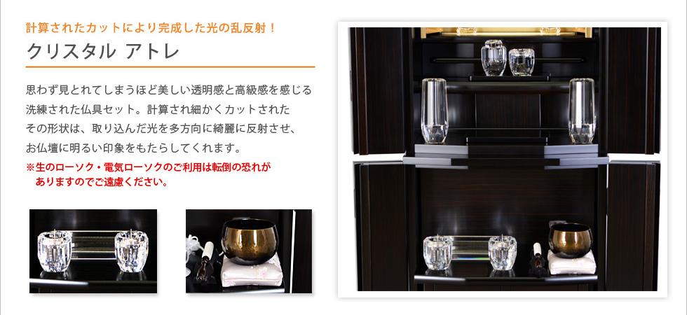 | ■ 機能 | 電動式オープン厨子扉 / 厨子部分LED間接照明 / 経机&リン収納型 / 上下台分離式 / 収納引き出し4杯 / 猫戸 |