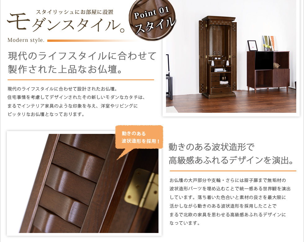 素材の良さを前面に押し出しながら、大戸や支輪さらには厨子扉まで無垢材の波状造形を施すことで動きのある立体的なデザインになっており、まるで北欧の家具を思わせる高級感あふれるお仏壇となっております。また、こちらのお仏壇は機能面や収納面も充実しており、電動お厨子扉や経机収納型、更には大戸スライド式を採用したため、お厨子がより見やすくなるように設計された、使いやすさ抜群のお仏壇となっております。