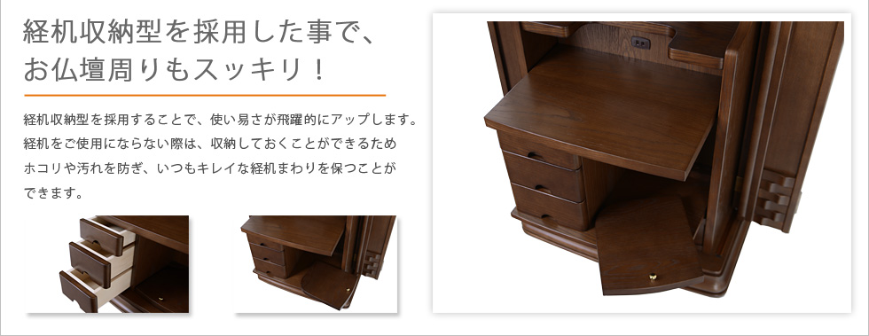 | ■ 機能 | 電動式オープン厨子扉(内折式) / LED照明 / 経机&リン収納型 / 収納引き出し / 小物いれ / 台輪引き出し |