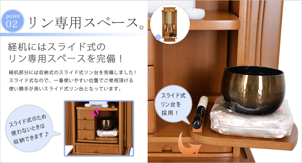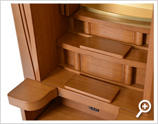 更に機能面も充実の花台スライド式、経机収納型、LED照明、電動式厨子扉などの豊富機能をも合わせ持つ新時代の家具調仏壇となっております。