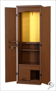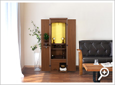 最近の住宅事情に合わせたシンプルでスリムなお仏壇を目指して製作しました。コンパクトで低価格なため、一人暮らしの学生や青年部、また新入会の方にも、お部屋の場所を選ばず設置できるオススメのお仏壇です。落ち着いた色合いのオークカラーはまるでインテリア家具のように自然に溶け込み、どんなお部屋にも違和感なく馴染みます。また、特装ご本尊様がご安置可能な大型お厨子に、機能面も大きめの収納引き出しや専用花台・専用リン台がついてますので綺麗に収納でき、使いやすさ抜群のお仏壇となっております。