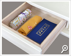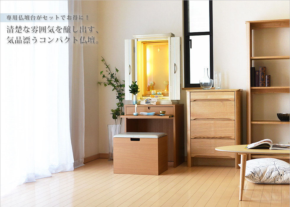 扉の取っ手部分には、輝くシルバーカラーを使用することで、お仏壇のアクセントになり可憐な佇まいでお部屋を彩ります。また、見た目もオシャレな専用仏壇台を使用すればお部屋の統一感が生まれると共に、毎日使う小物などすっきりと収納しておくことができるので大変便利になっております。