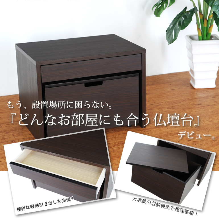 【商品説明】 上置き仏壇専用の仏壇台です。高さも低めに作られておりますので和室に設置していただき正座をして勤行していただくとちょうど良いサイズとなっております。また、収納引き出しキャスター付&収納付の経机を完備した機能面も抜群の商品となっております。