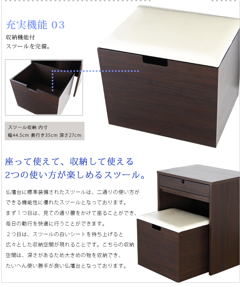 スツールに座って勤行ができるため、足や膝が悪くて正座ができない方にもおすすめできる仏壇台となっております。