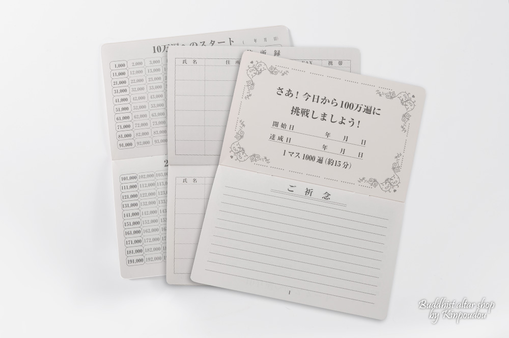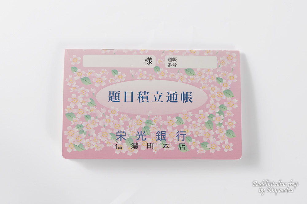 可愛い桜模様の表紙が特徴的!百万遍を目標に作られた、貯金通帳タイプの題目帳です。ページを開くと応援メッセージが書かれています。