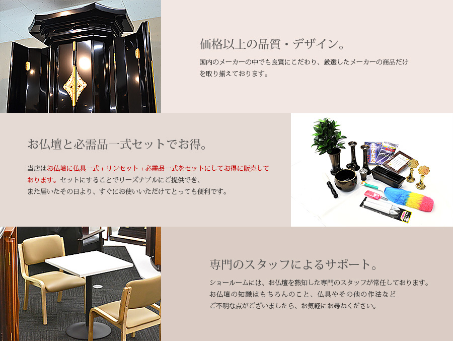 岡山店は、伝統的なお仏壇やおしゃれでコンパクトな家具調仏壇をはじめ、仏具やお線香なども豊富に展示予定です。当店は、お仏壇ご購入後のアフターケアも充実しており、初めてお仏壇をお求めになるお客様も安心してお選びいただけるとご好評いただいております。